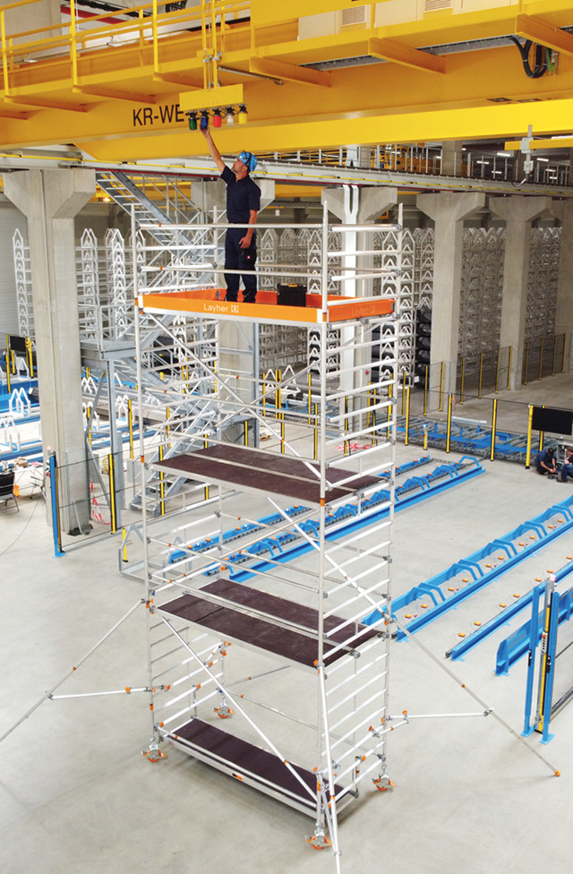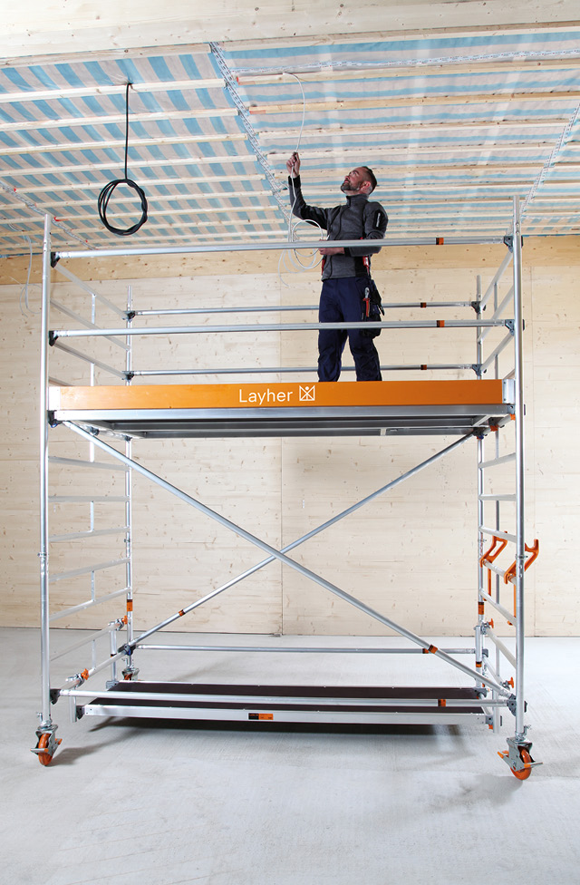 Das Universalgerüst Uni Breit mit dem doppelt breiten Arbeitsboden ist der bequeme Arbeitsplatz in großer Höhe.