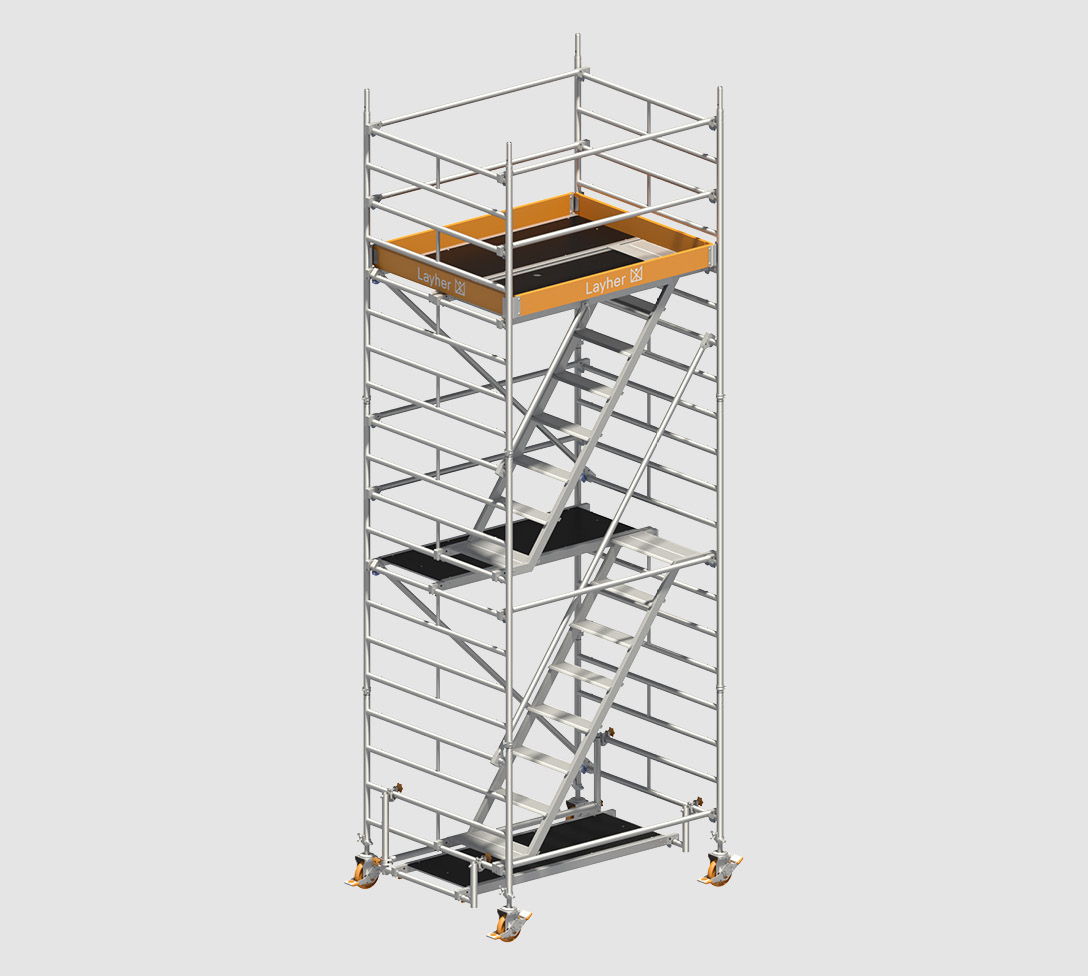 Der bequeme Treppenaufstieg mit durchgehendem Handlauf begünstigt vermehrtes Auf- und Absteigen, er überbrückt leicht große Höhen und lässt die Hand frei zur Mitnahme von Werkzeug und Material.