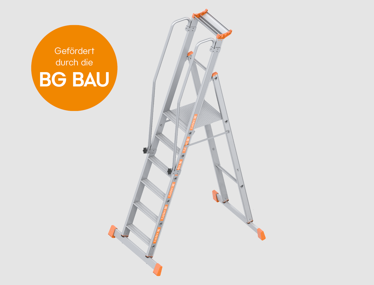 Erhöhte Trittsicherheit durch ausgeprägte Riffelung auf Stufen und Sprossen, entspricht der Rutschsicherheit R12 in Trittrichtung. 80 mm tiefe Stufen entsprechen den TRBS 2121-2-Richtlinien.